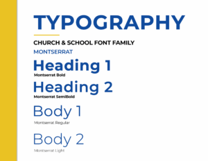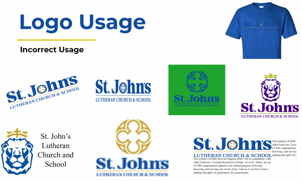 Click a button to jump to that section on the page Church Logos School Logos Colors Fonts Things to Keep in Mind Don’t rotate the logoDon’t stretch or squish the logoDon’t use improper color backgroundsDon’t put dark logos on dark backgroundsDon’t adjust the colors or apply “filters”Don’t add your own fontsDon’t use low-resolution logosAlways give generous spacing around logos Church Logos For use in all Digital Applications and in Small Print Horizontal Logos Full Blue Download .PNG Full White Download .PNG Square Logos Full Blue Download .PNG Full White Download .PNG For use in Large Scale Print only — No Digital Use Horizontal Logos Full Color — Light Background Download .PNG Full Color — Dark Background Download .PNG Square Logos Partial Color — Light Background Download .PNG Partial Color — Dark Background Download .PNG Full Color — Light Background Download .PNG Full Color — Dark Background Download .PNG School Logos For use in all Applications Horizontal Logos Full Color — Light Background Download .PNG Full Color — Dark Background Download .PNG Full Blue Download .PNG Full White Download .PNG Square Logos Full Color — Light Background Download .PNG Full Color — Dark Background Download .PNG Full Blue Download .PNG Full White Download .PNG Colors for Church and School Royal Blue #104B9D Gold #C39A2E Navy Blue #022453 White #FFFFFF Royal Blue #104B9D Gold #C39A2E Yellow #EAC223 Light Blue #73B3DD Fonts for Church and School Montserrat Bold: St. John’s Headlines Montserrat SemiBold: St. John’s Headlines 2 Montserrat Regular: St. John’s Paragraph Text Montserrat Light: St. John’s Paragraph Text 2